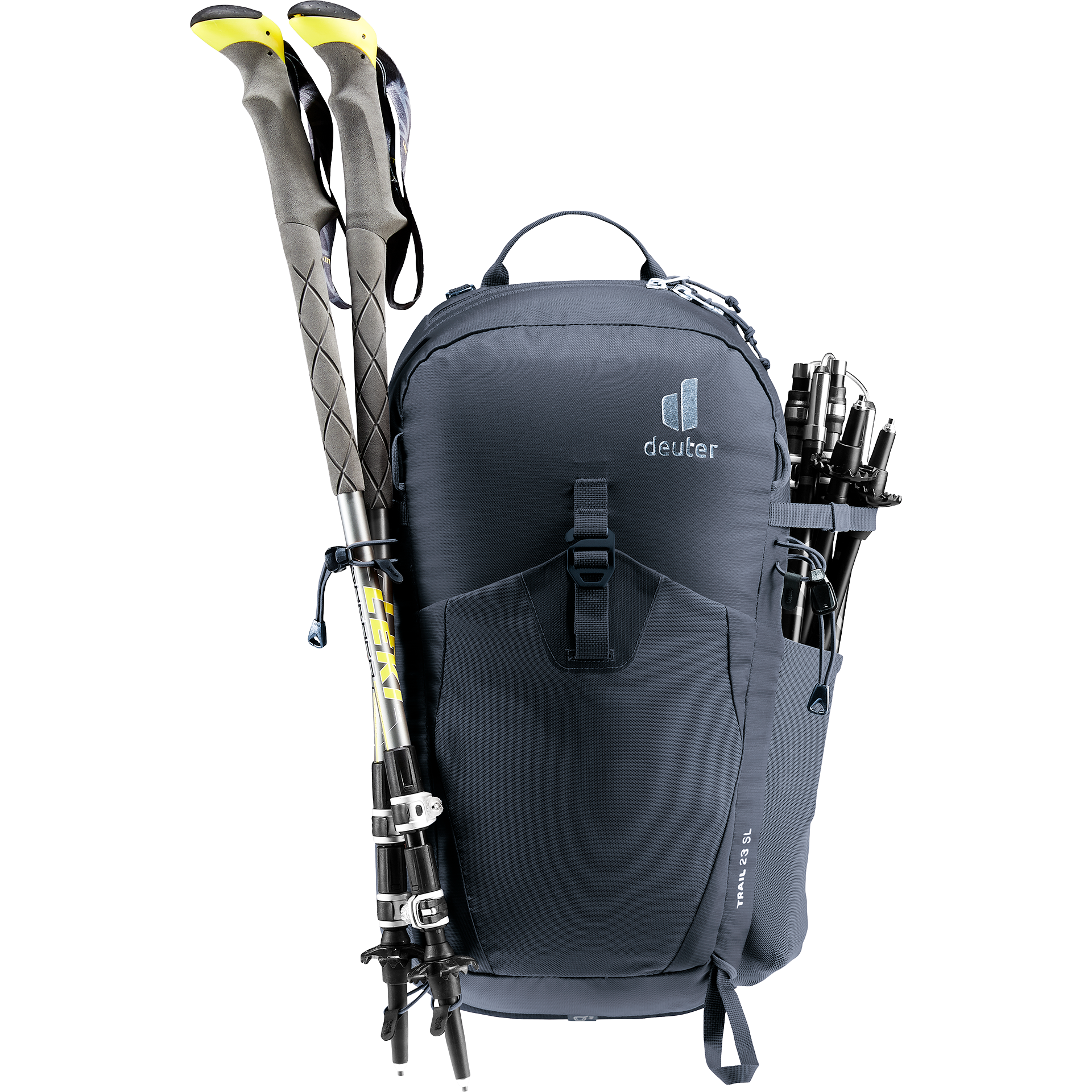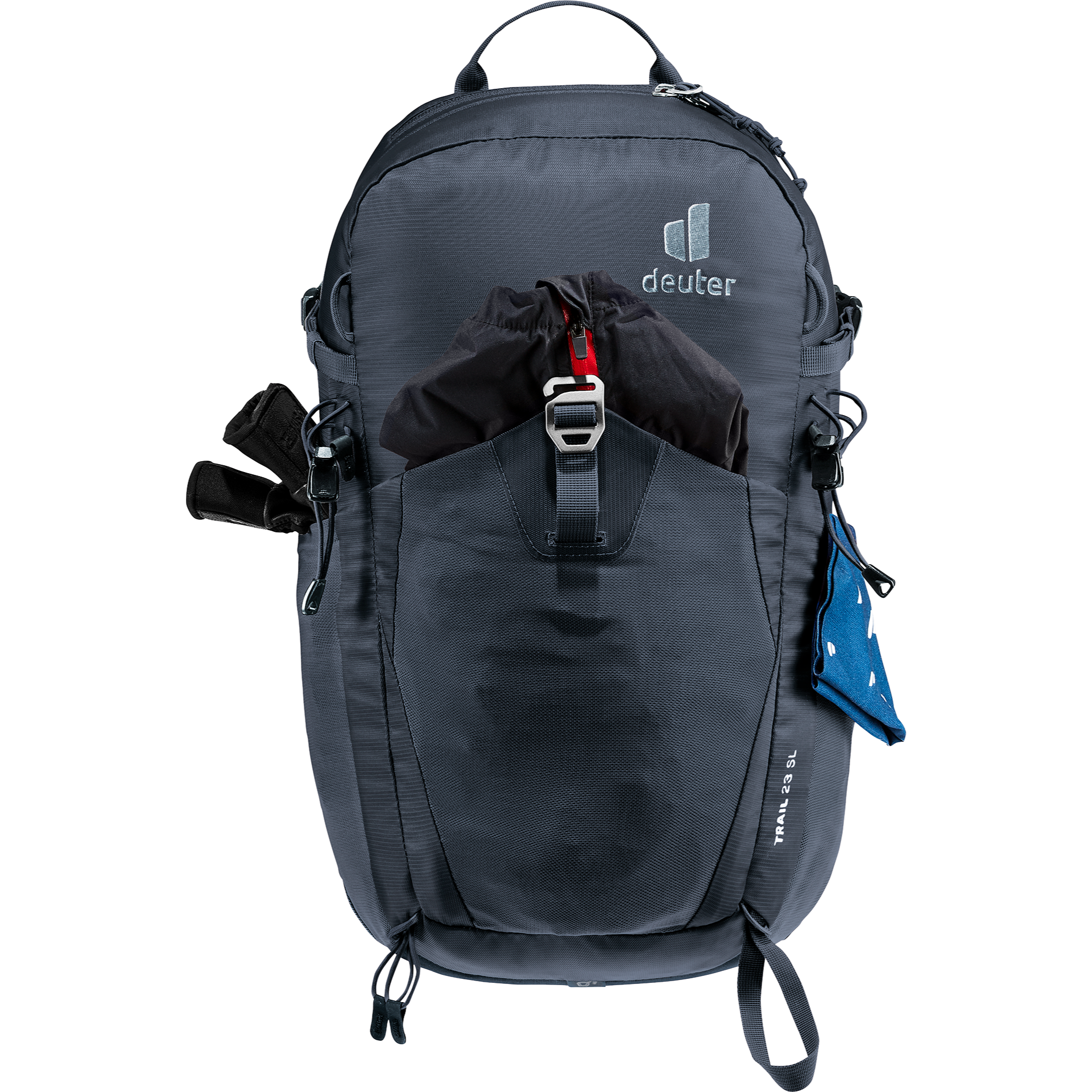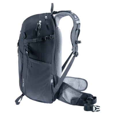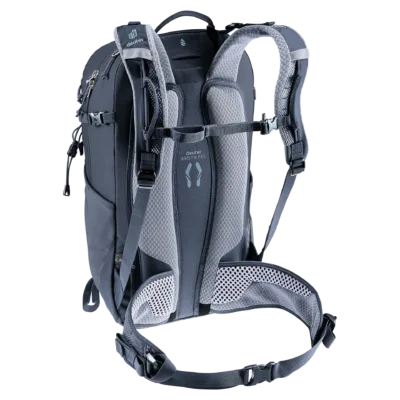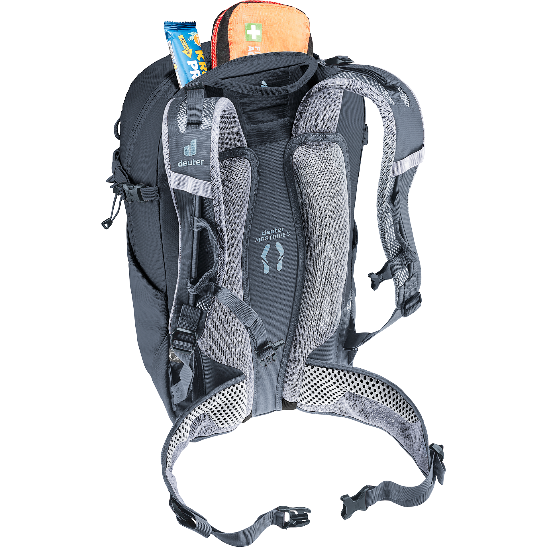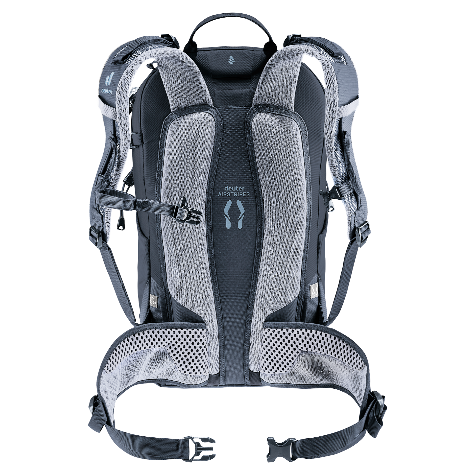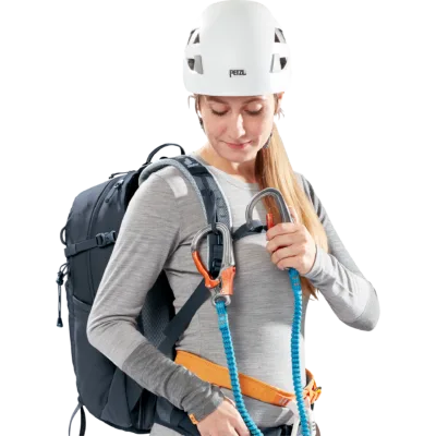 La reducida superficie de contacto, los grandes canales de ventilación del sistema dorsal deuter Airstripes, las aletas y los tirantes perforados garantizan el máximo flujo de aire y una distribución uniforme del peso, para un ajuste cómodo y seguro en cualquier terreno. Los lazos de los tirantes mantienen los mosquetones de vía ferrata a mano. Y gracias a una gran abertura de la cremallera frontal, a sus bolsillos elásticos frontales y laterales, siempre es fácil acceder al equipo.